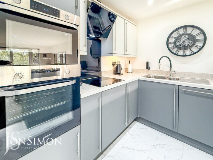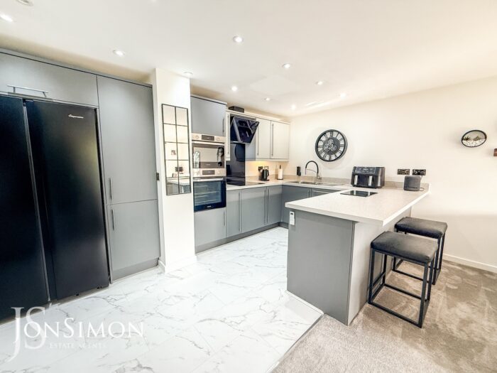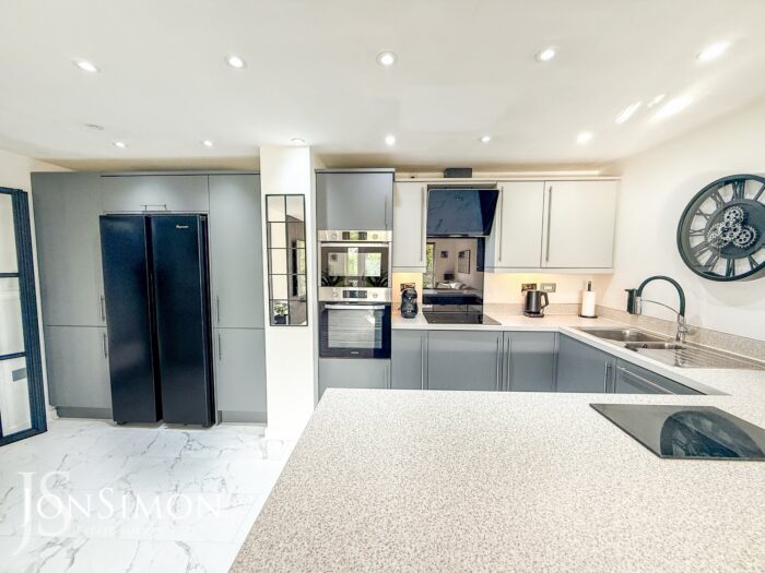 A modern range of wall and base units with complementary surfaces, four ring induction hob with extractor unit above, electric oven, breakfast bar, 1 1/2 bowl sink unit with drainer, integrated dishwasher, microwave, under unit lighting andceiling spotlights.