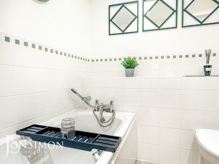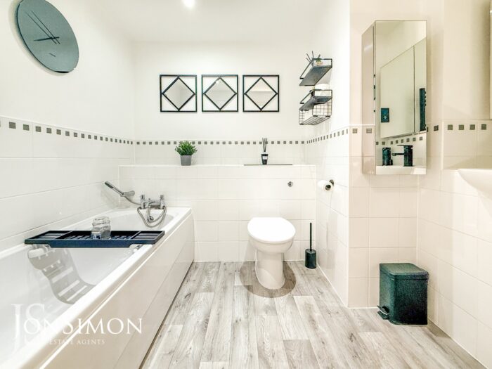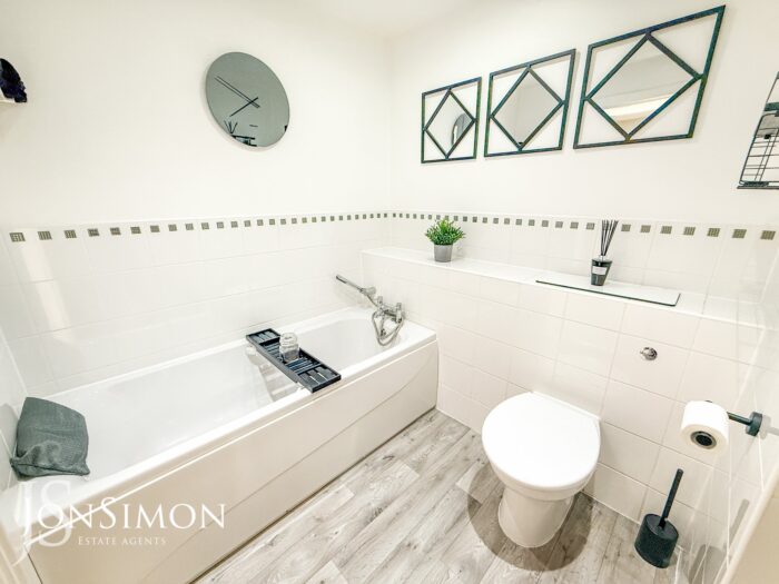 A three-piece white modern bathroom suite comprising of a panel bath with mixer tap and shower head, Low level WC, wash hand basin, part tiled walls, radiator, extractor unit and ceiling spotlights.