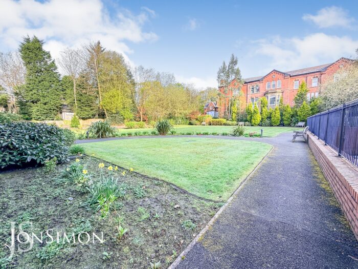 A generous well maintained central communal lawn garden with mature garden borders and shrubs.