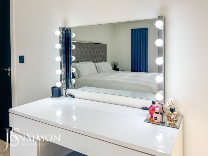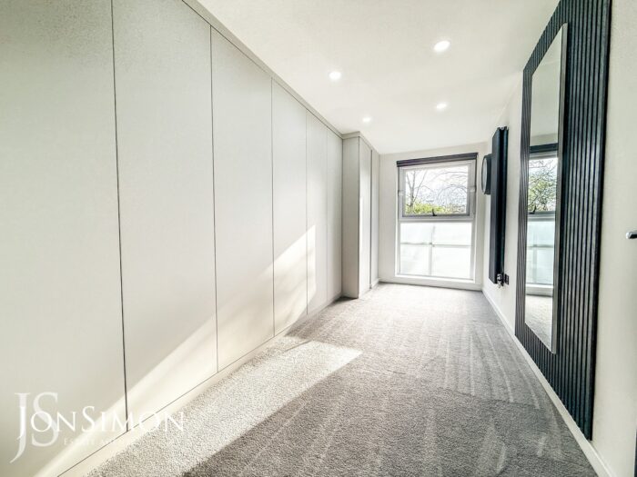 UPVC double glazed window, radiator, fitted wardrobes and storage cupboard housing the Combi boiler and ceiling spotlights.