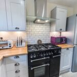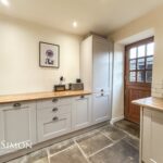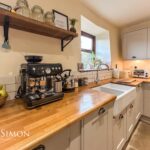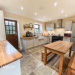 A beautiful fitted modern kitchen with a range of wall and base units with complementary wooden worksurface, two bowl Belfast sink with mixer tap, electric range cooker with five ring gas hob, extractor above, part tiled walls, integrated washing machine and dishwasher, combi boiler, York stone flooring with underfloor heating, under unit lighting, ceiling spotlights, double glazed rear window and double glazed stable back door.