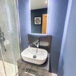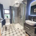 A modern three-piece white suite comprising of a large walk-in shower unit, low level WC with storage drawer, wash hand basin, electric wall mounted mirror, radiator, part tiled walls and flooring, ceiling spotlights, extraction unit and double glazed rear window.