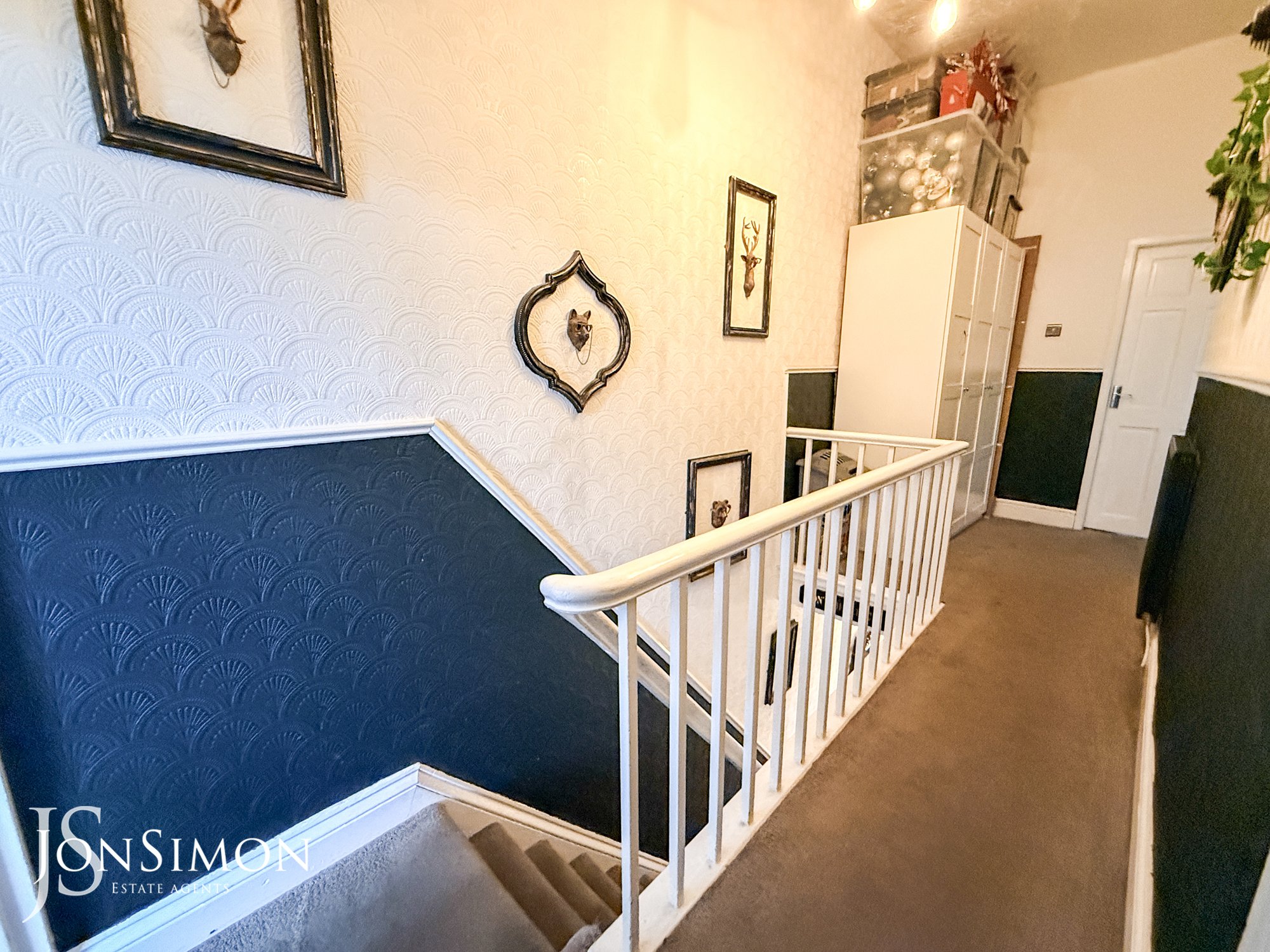 Spacious landing, white spindle balustrade, contrasting carpets, central heating radiator and loft access.