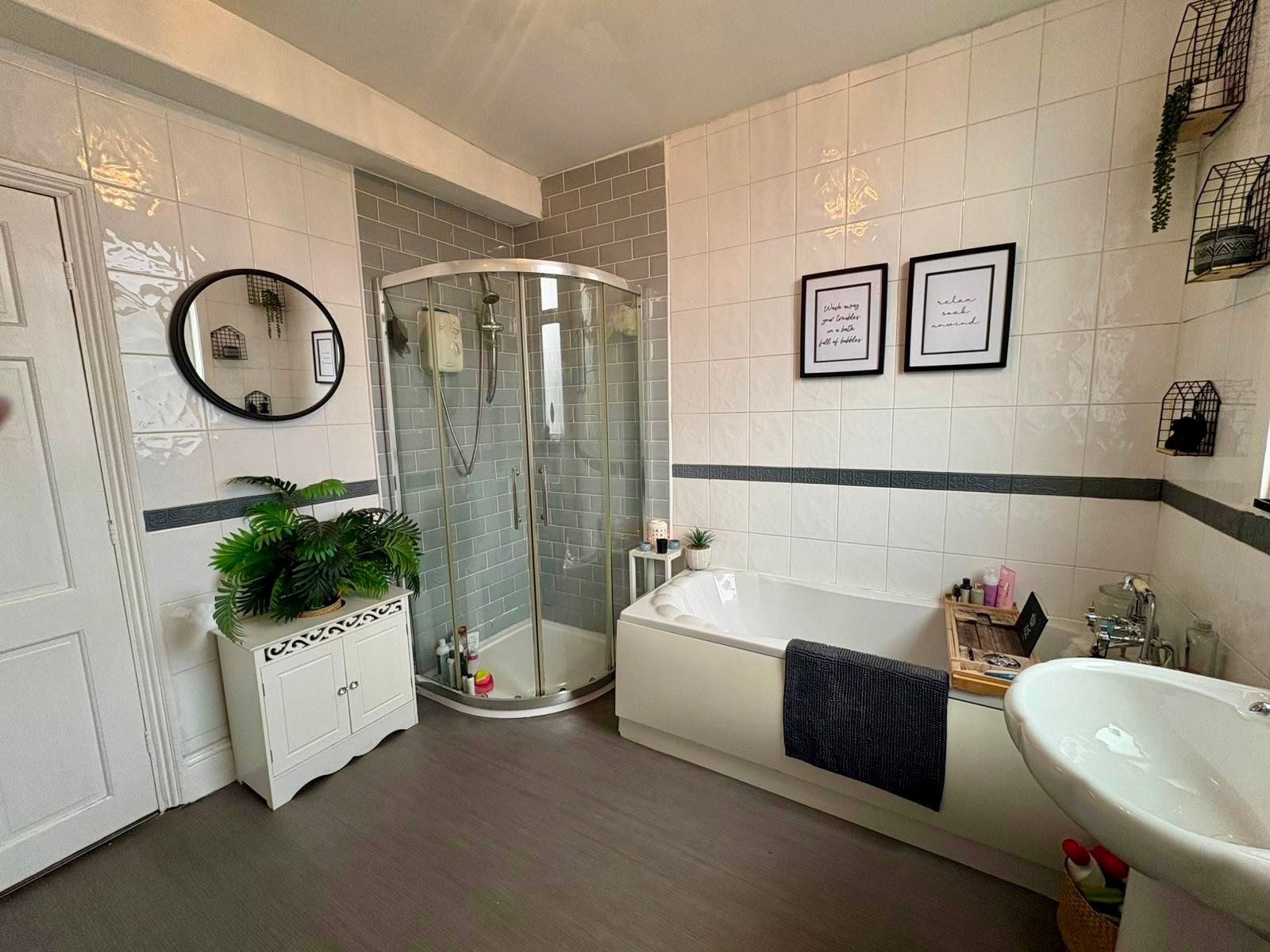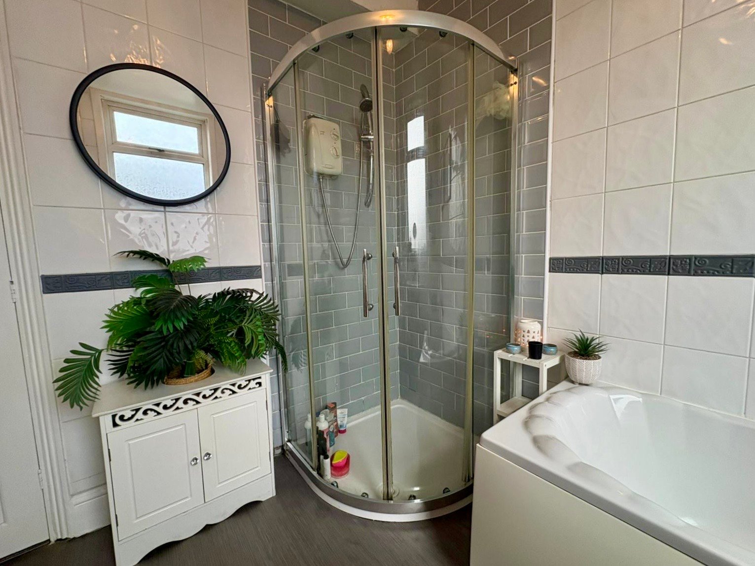A very spacious bathroom with a four piece suite in white comprising of corner shower enclosure with Triton electric shower, panel bath, pedestal hand wash basin, low level Wc, white ceramic wall tiling, central heating radiator, UPVC double glazed window to the rear elevation and ceiling light point.