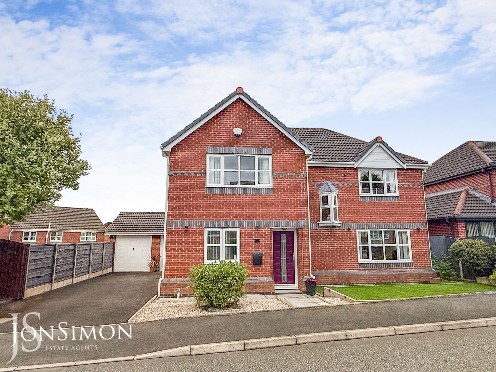 Front: A large tarmac driveway for several cars, artificial lawn with well established borders and shrubs.