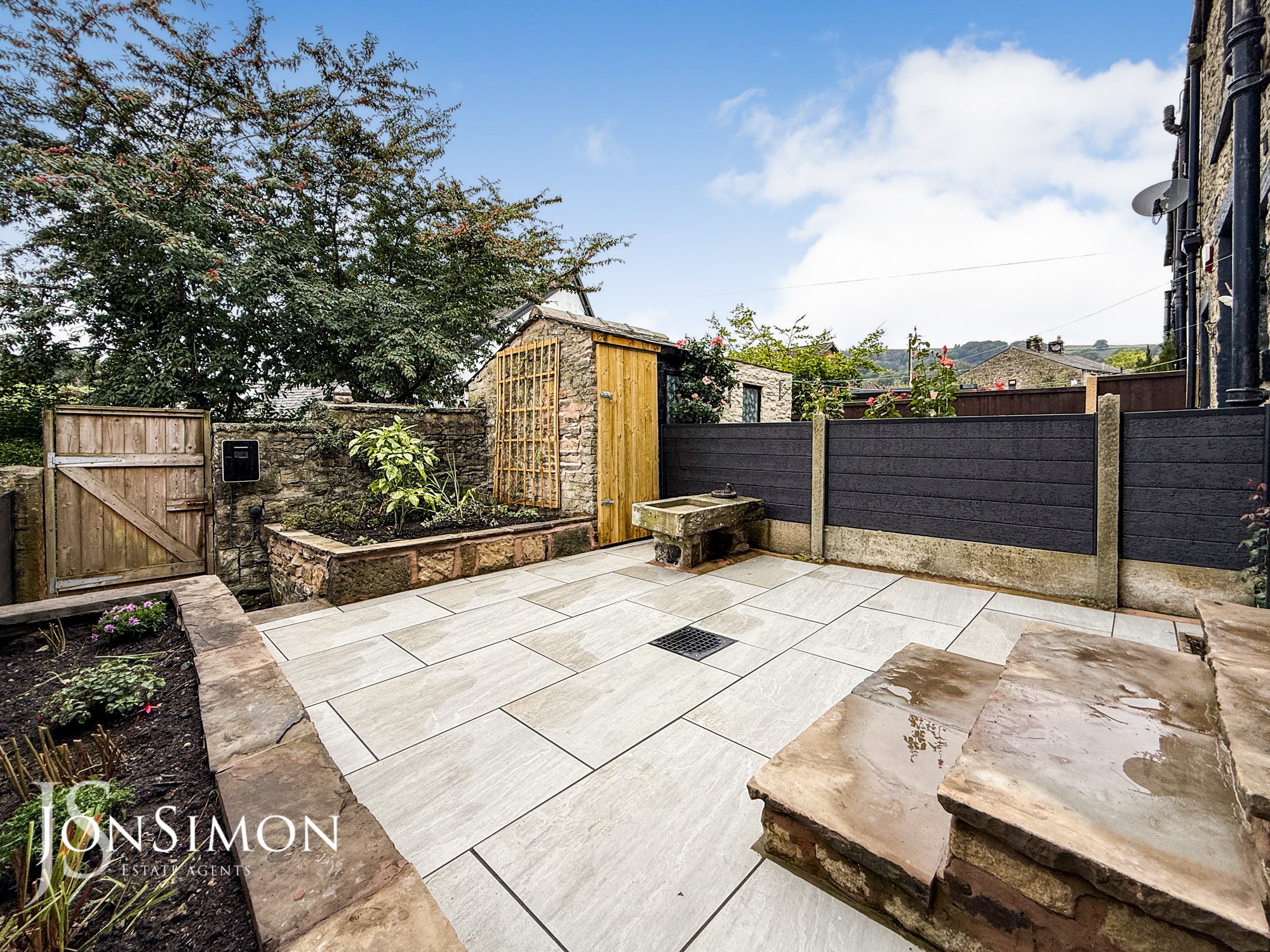 A low maintenance rear yard with tiled patio area, well-maintained borders and shrubs, stone built shed, outside water tap, EV charging point and gated access to the rear.