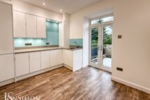 A contemporary fitted kitchen with a range of wall and base units with complimentary worksurface, single bowl sink unit with hot water tap, integrated fridge, freezer, dishwasher, microwave and electric oven, four ring electric hob with extractor unit above, radiator, combi boiler, plumbed for washing machine, ceiling spotlights and UPVC double glazed French patio doors.