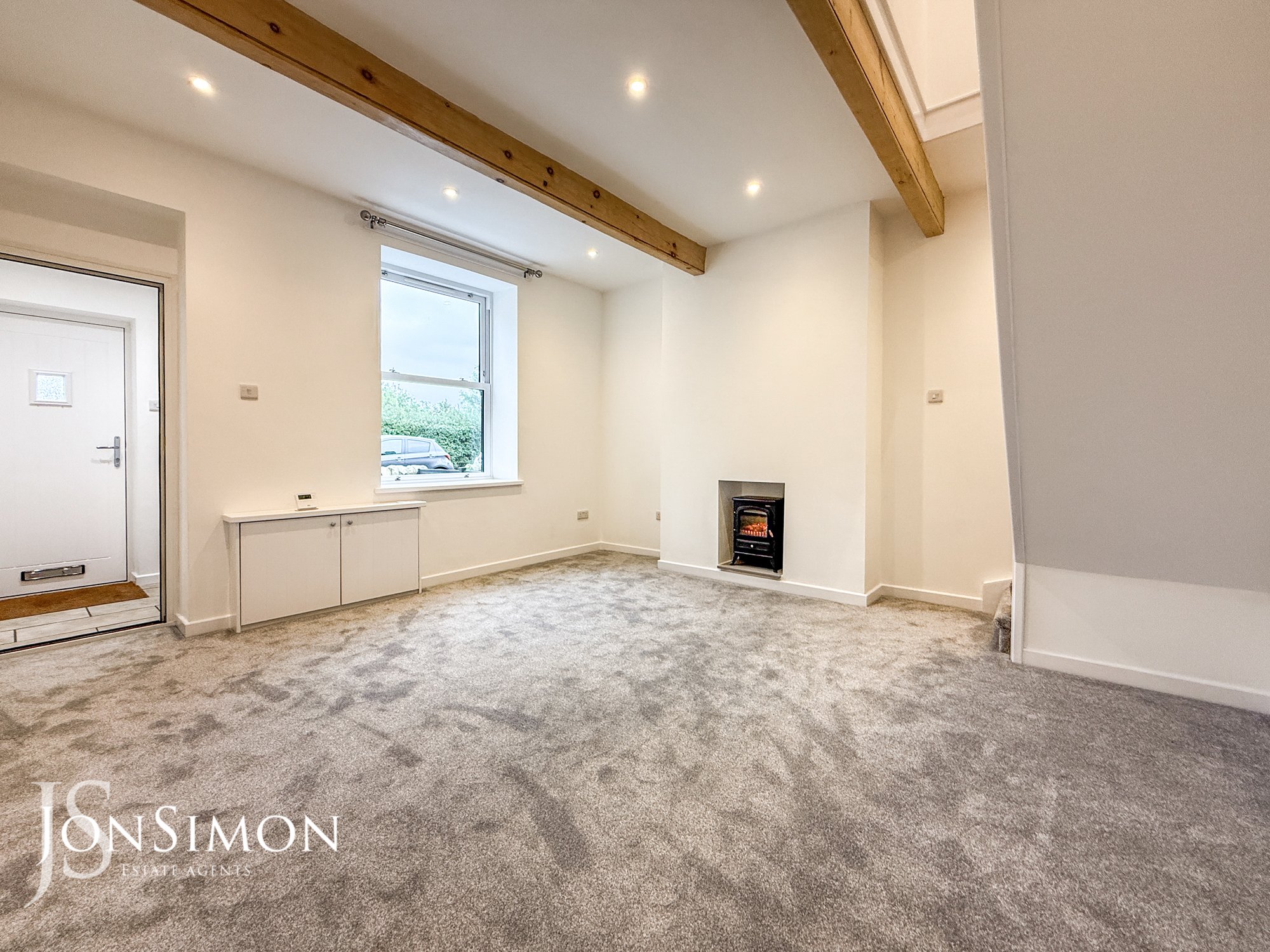 UPVC double glazed sash front window, feature electric stove, ceiling beams, radiator, meter cupboard, ceiling spotlights and stairs leading to the first floor landing.