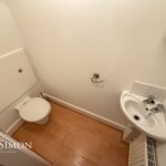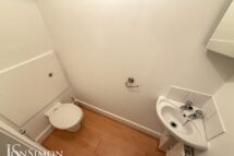 A two piece white suite comprising of a low WC, wash hand basin, radiator, laminate flooring and ceiling point.