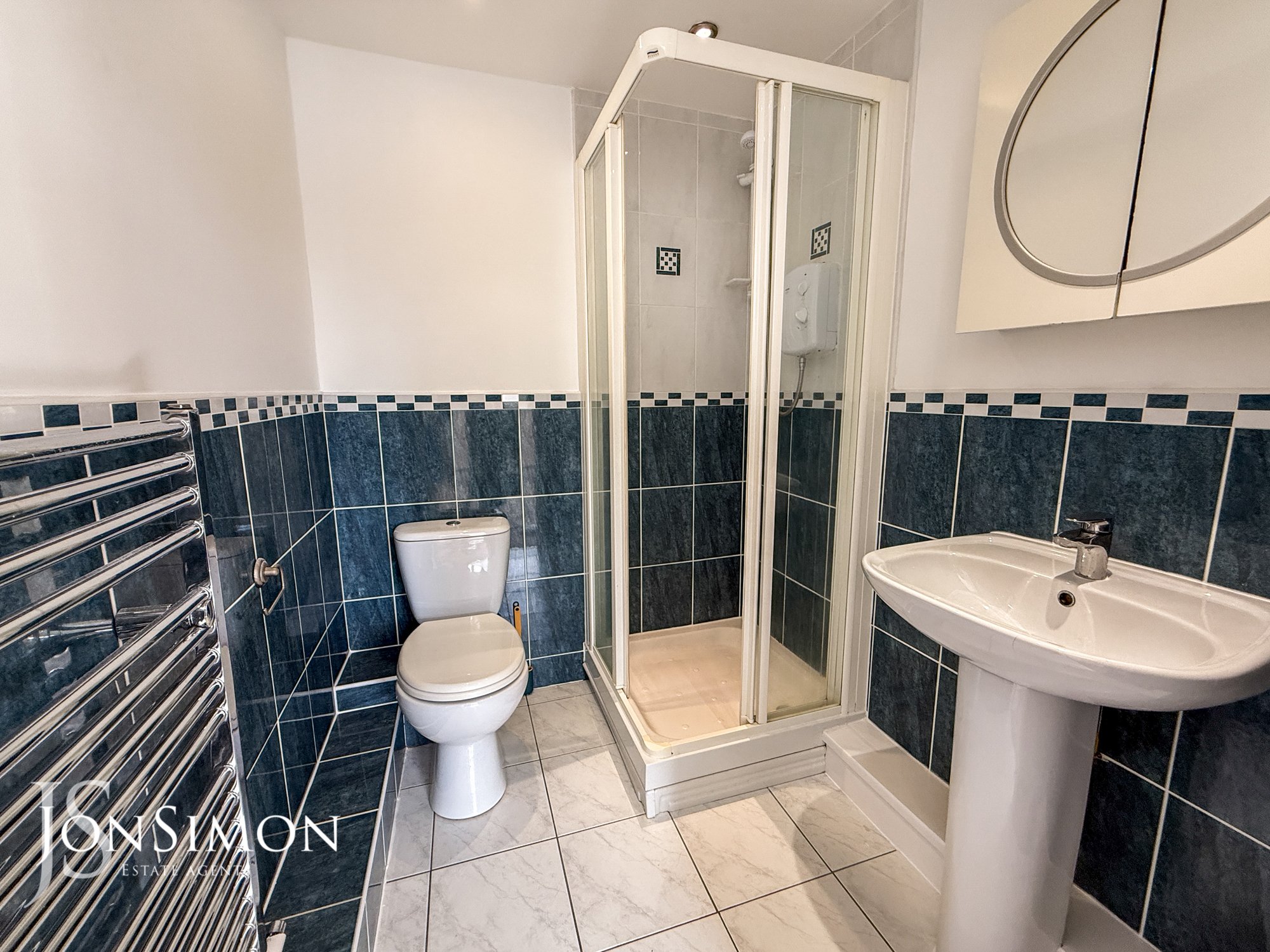 A three-piece white suite comprising of a panelled bath with mixer tap, shower above, glass shower screen, wash hand basin, low level WC, chrome towel radiator, extractor unit, fully tiled walls and flooring, ceiling spotlights and double glazed front window.