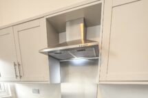 A brand new fitted kitchen with a range of wall and base units with complementary works surfaces, four ring electric hob with extractor unit above, electric oven, plumbed for washing machine, combi boiler, radiator, ceiling point, 1 1/2 bowl sink unit with drainer, UPVC double glazed rear windows and UPVC double glazed door.