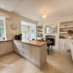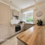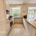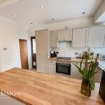 A modern fully fitted kitchen with a range of wall and base units with complimentary wooden work surfaces, four ring electric hob with extractor unit electric oven, integrated fridge, freezer, dishwasher and washing machine, single bowl sink unit with drainer, part tiled walls, radiators, built-in storage cupboards and shelves, electric stove, ceiling spotlights, Velux window, ceiling point, UPVC double glazed windows, UPVC double glazed French patio doors and back door.