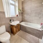 A modern three-piece white bathroom suite comprising of a tile bath with mixer tap, glass shower screen with shower above, low level WC, wash hand basin, chrome tiled radiator, ceiling point and UPVC double glazed side window.