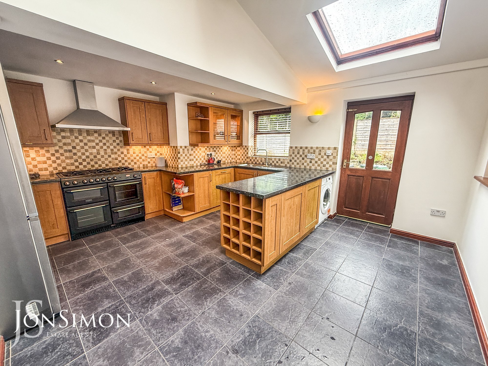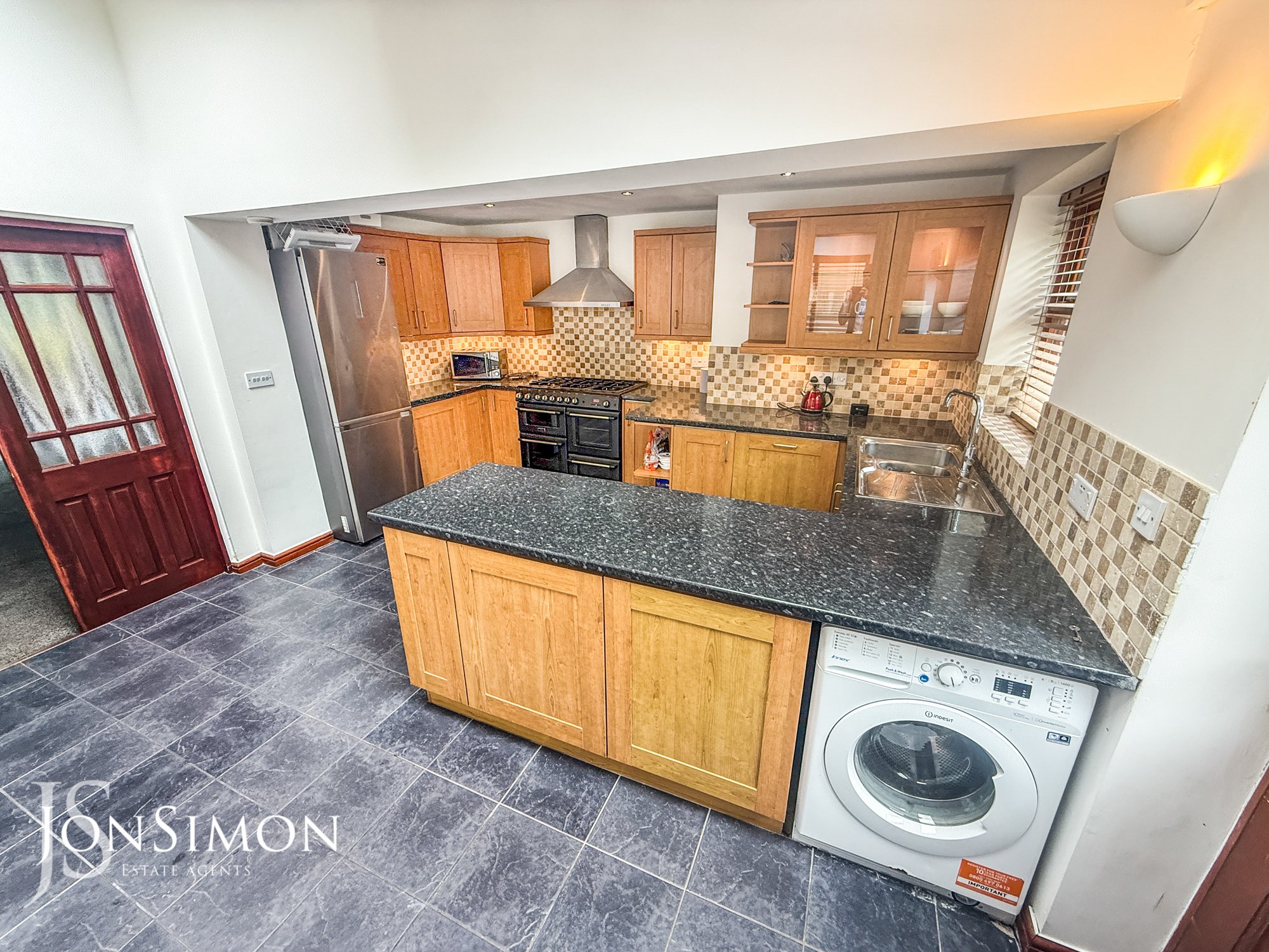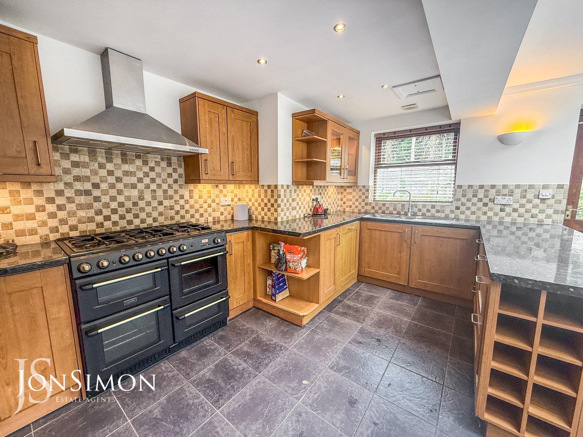 13' 11'' x 10' 1'' (4.24m x 3.07m) With a range of modern fitted wall and base units incorporating a single drainer stainless steel sink unit with centre vegetable drainer and mixer tap, concealed lighting, splash tiling, oven with six ring gas hob, overhead extractor canopy, integrated wine-rack, low voltage lighting, integrated fridge, integrated dishwasher, integrated washer, integrated dryer, ceramic tiled floor, double glazed window, extractor fan, open plan to breakfast room.