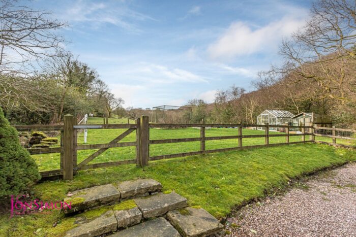 Well maintained lawn area, well established borders and shrubs, greenhouse, summerhouse with decked patio area, vegetable borders with views over farmland and woodlands.