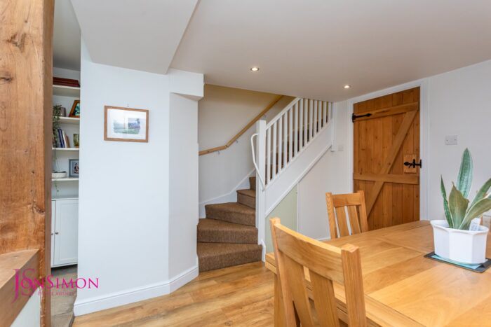 UPVC double glazed front window, stone flooring, radiator, storage cupboards, built-in shelves and large storage cupboard housing the combi boiler, ceiling spotlights and stairs leading to the first floor landing.