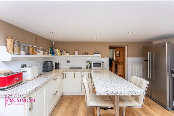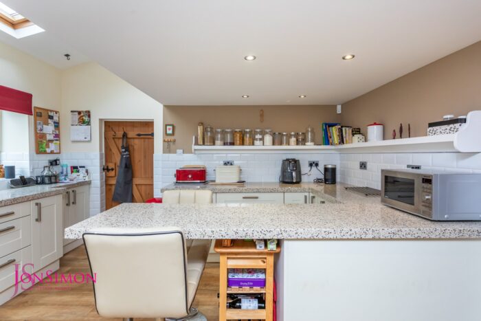 A modern range of wall and base units with complementary worksurface, one and a half bowl sink unit with drainer, range cooker with five ring gas hob with extractor unit above, electric ovens, part tiled walls, integrated washing machine, dishwasher and American style fridge and freezer, breakfast bar, radiator, ceiling spotlights, ceiling point, two Velux windows and UPVC double front windows,