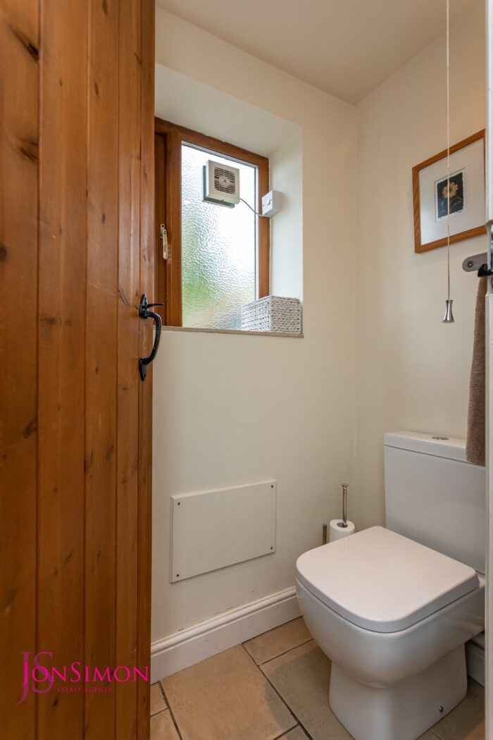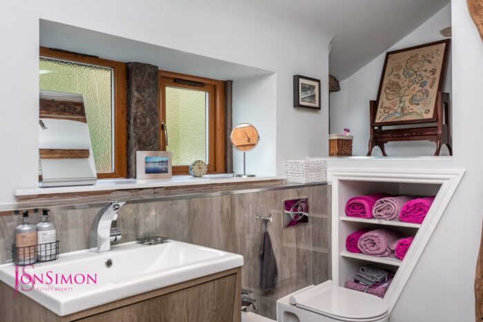 A beautiful five piece white bathroom suite comprising of a panel bath with mixer tap and shower head, low-level WC, bidet, wash hand basin with storage drawers underneath, walk-in shower unit, feature towel radiator, ceiling beams, ceiling point and UPVC double glazed front windows.