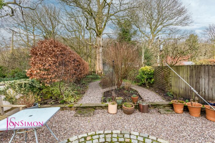 Rear: Pebbled patio area, borders and shrubs with side access.