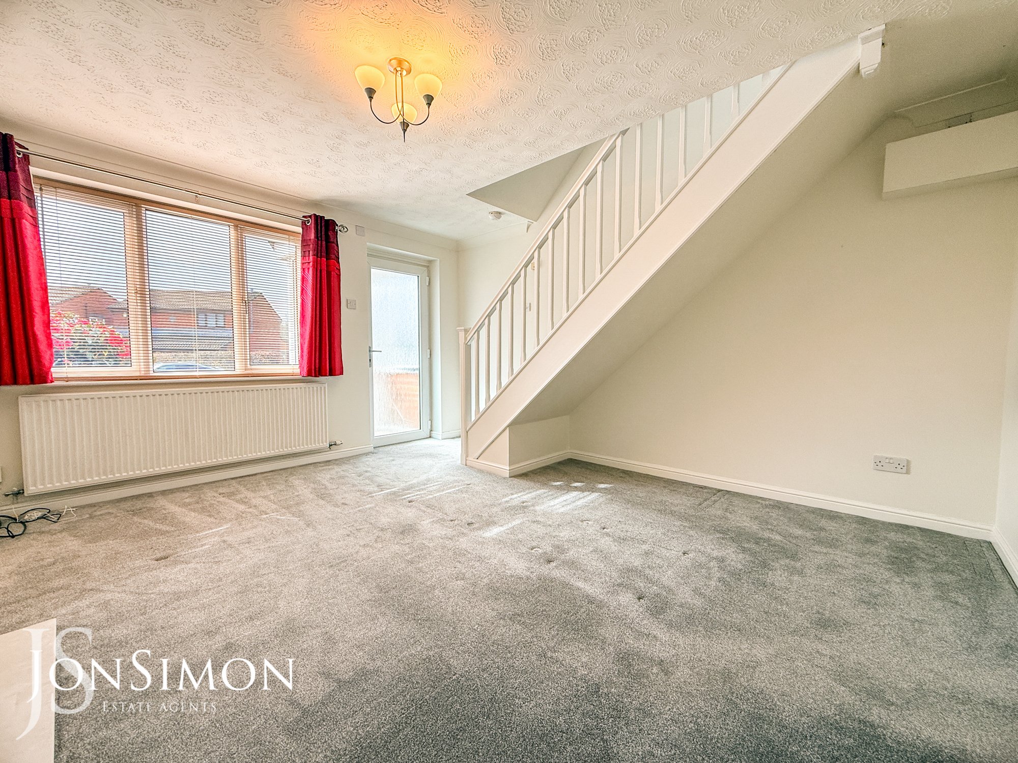 UPVC double glazed front window, coal effect gas fire with surround, radiator, ceiling coving, stairs leading to the first floor landing.