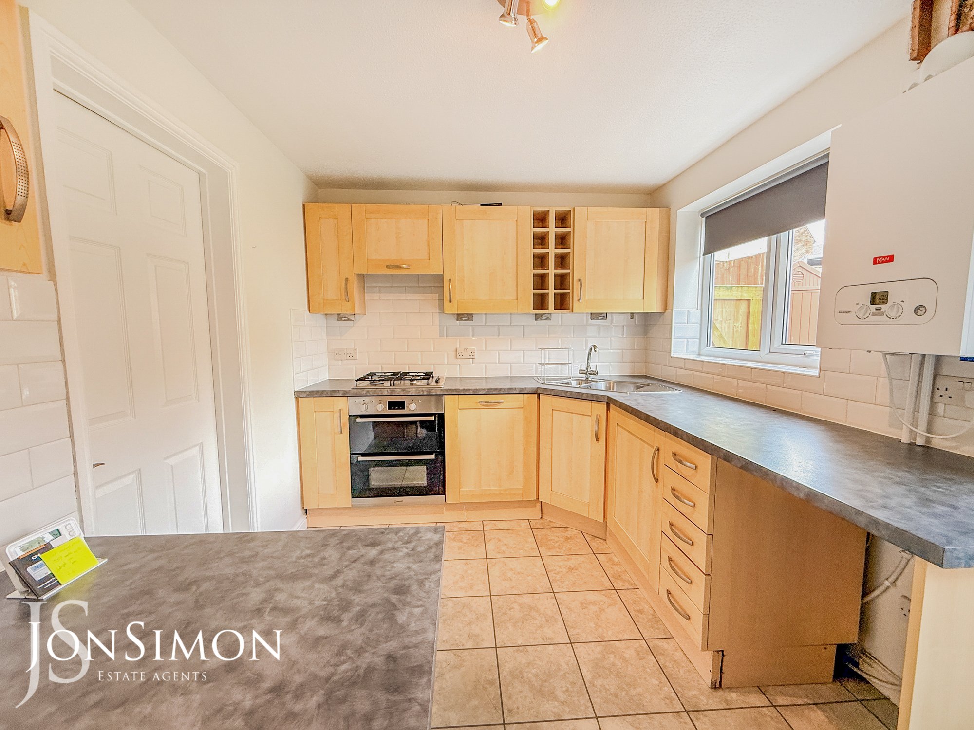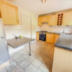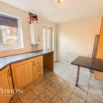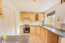 Range of wall and base units with complimentary work surfaces, 1 1/2 bowl sink unit with drainer, four ring gas hob with extractor unit above, double electric oven, dishwasher, washing machine, combi boiler, radiator, breakfast bar, tiled effect flooring ceiling point, UPVC double glazed rear window and back door.