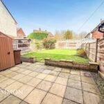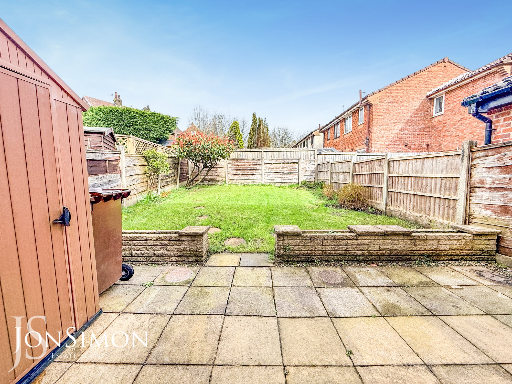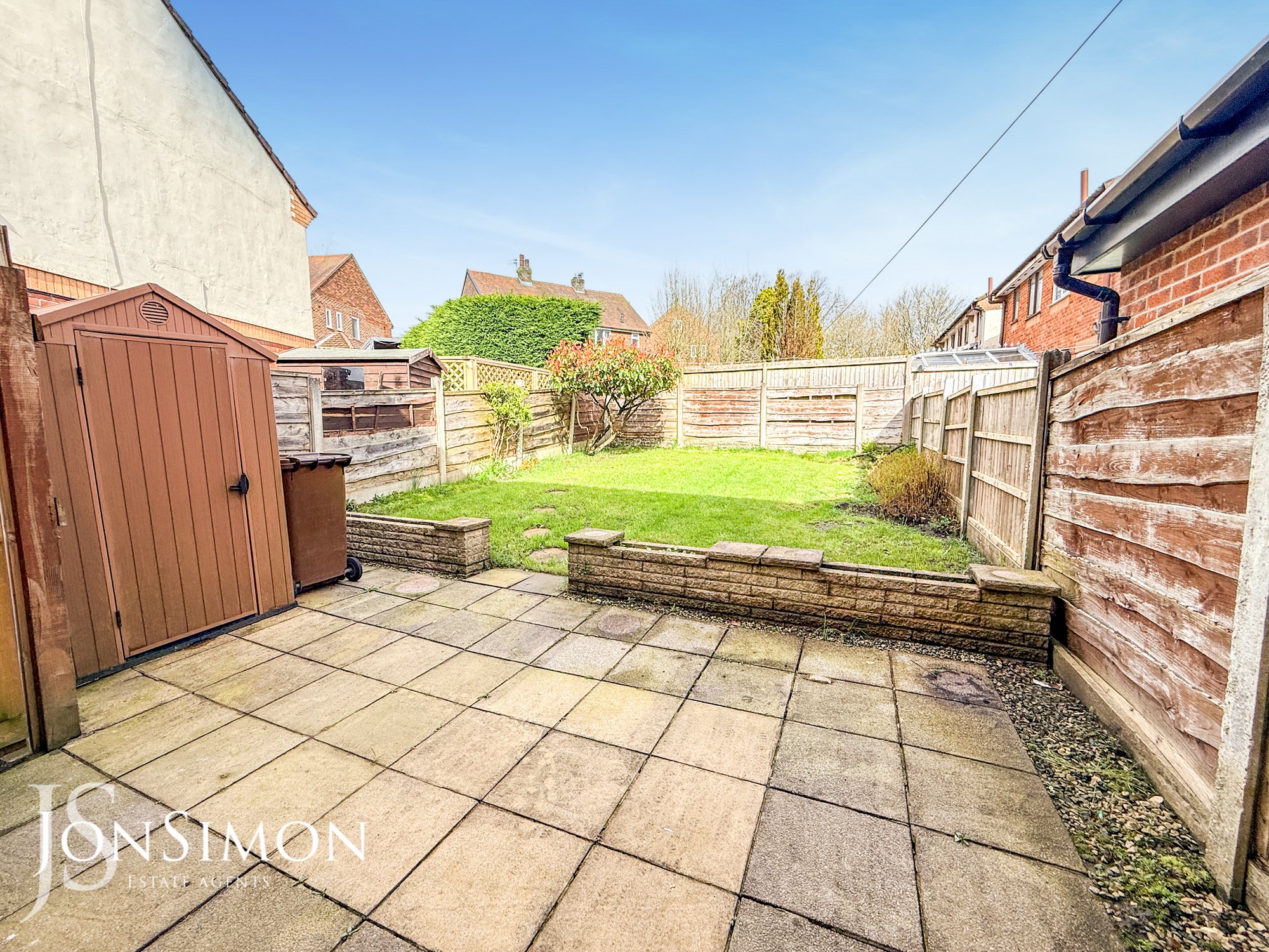Rear: A peeved patio area, one area, borders and shrubs, shed, fence panels around and gated access to the side.