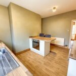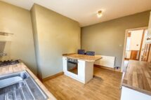 Modern kitchen with range of wall and base units, island console, built in four ring gas hob, oven and extractor, integrated fridge, tiled elevations, UPVC double glazed window to the rear.