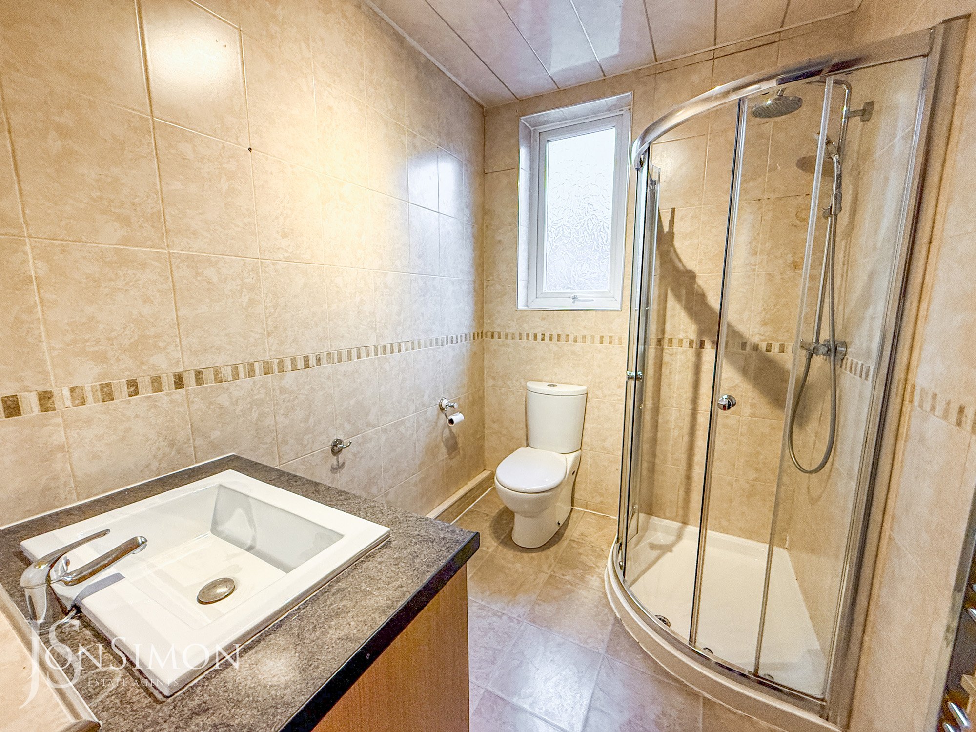 Modern shower room comprising, wc, wash hand basin set in vanity, quadrant shower, tiled elevations and flooring, heated towel rail, UPVC double glazed window to the rear.