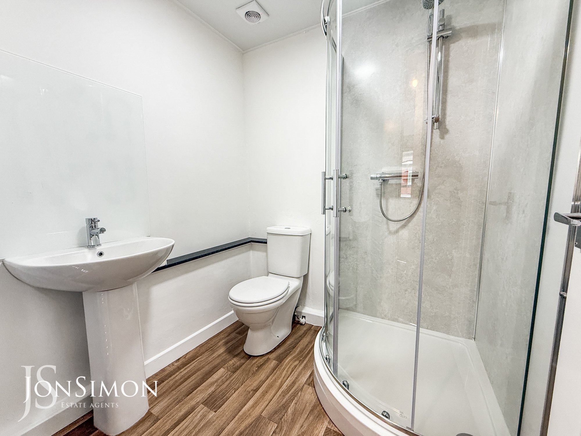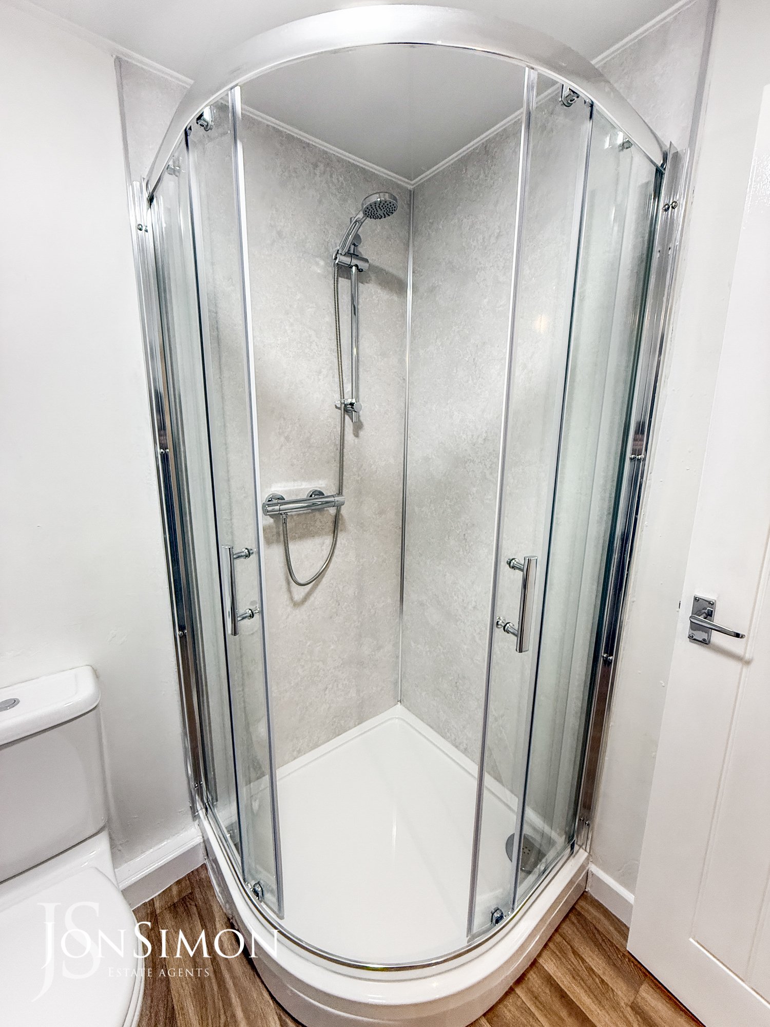 A modern three-piece white suite comprising of a walk-in shower unit, low level WC, wash hand basin, chrome towel radiator, extractor unit and ceiling point.