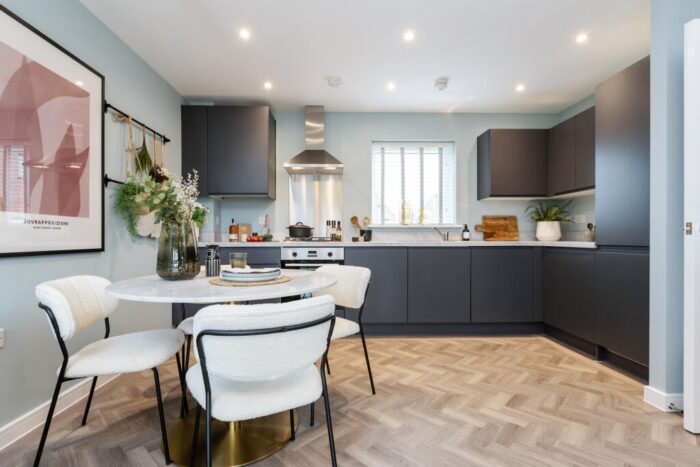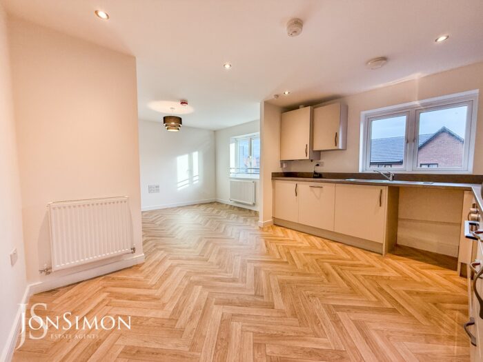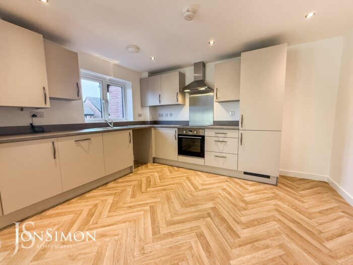 A brand-new modern fitted kitchen with a range of wall and base units with complimentary worksurface, single bowl sink unit with drainer, Four ring induction hob with extract unit above, electric oven, integrated fridge, freezer and dishwasher, Combi boiler, plumbed for washing machine, radiator, ceiling spotlights, extractor unit and UPVC double glaze window.