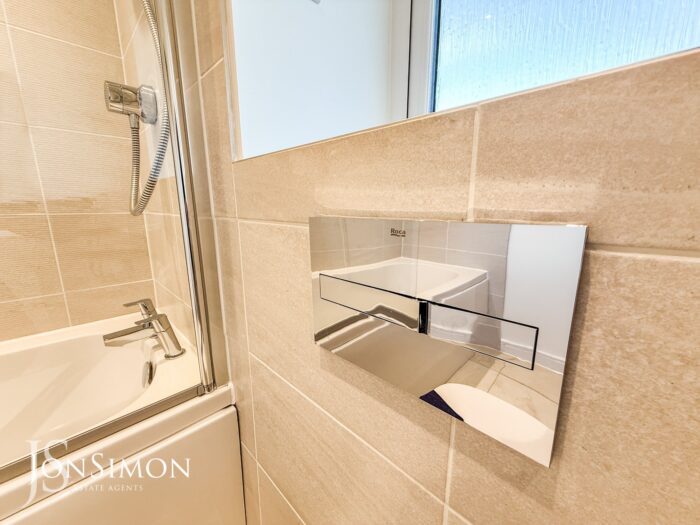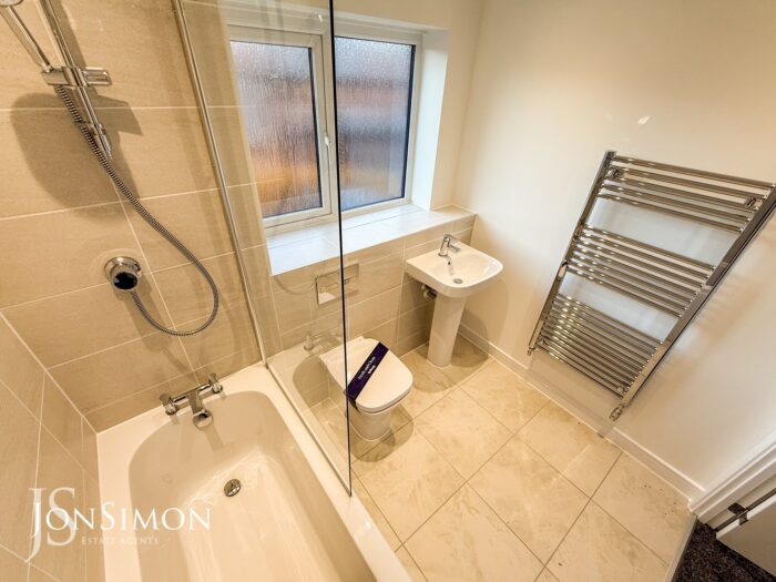 2.238m x 1.913m A modern three-piece white suite comprising of a panel bath shower screen, shower above, low level WC, wash hand basin, chrome radiator, tiled walls and flooring, ceiling spotlights, shaver point, extractor unit and UPVC double glazed window.