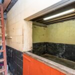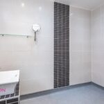 Tile flooring, radiator, tiled walls and ceiling point.