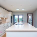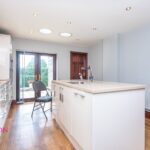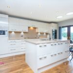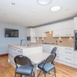 A modern fully fitted kitchen with a range of wall and base units with complementary work surfaces, single bowl sink unit with drainer, hot water tap, four ring induction hob with extractor unit above, double electric oven, integrated microwave, fridge and dishwasher, breakfast bar, radiator, light tunnels, ceiling spotlights, under unit lighting, wood effect flooring, UPVC double glazed French patio doors and TV point.