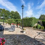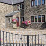 Front: Remote controlled electric double gates, Large cobbled driveway for several cars, well maintained boards and shrubs, external lighting, additional manual double gates and stone wall boundary.