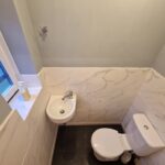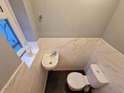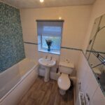 UPVC double glazed window to the front with bevelled, leaded and frosted glass design, three piece spacious White suite comprising low level WC, pedestal wash hand basin, panelled bath with a Aqua Tronic 2 plus electric shower over, splash back tiling to complement, radiator, airing cupboard housing tank, textured ceiling.