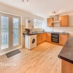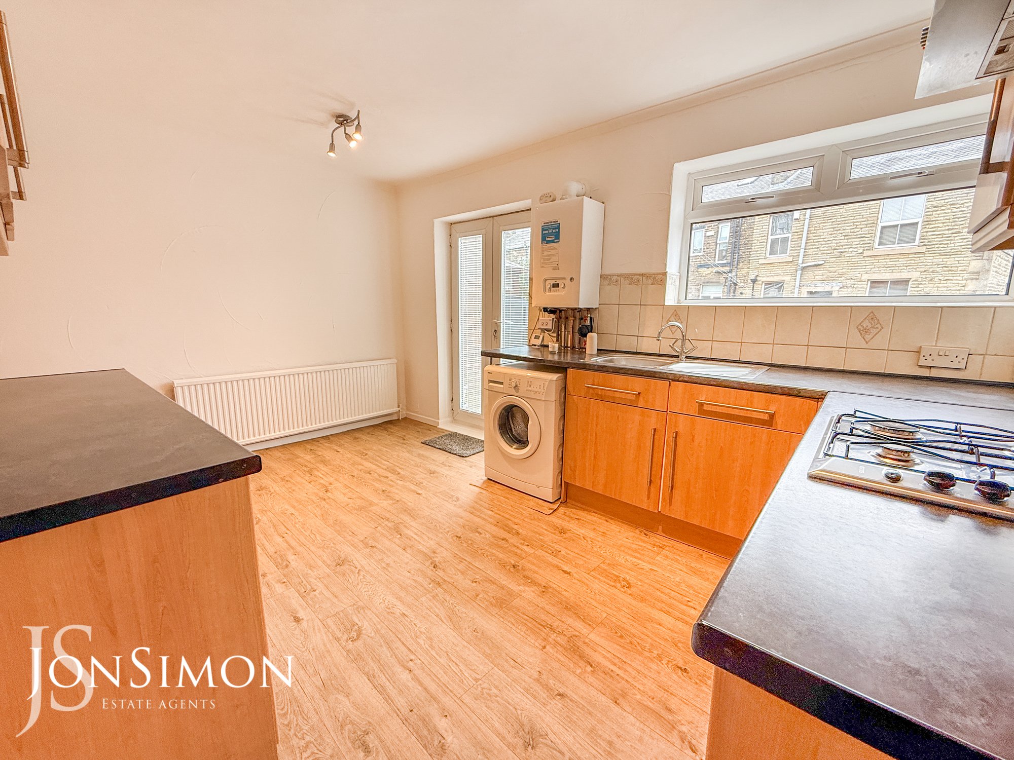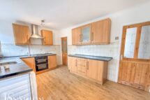A range of wall and base units with complementary work surface, four ring gas hob with extractor unit above, double electric cover, single bowl sink unit with drainer, parts tiled walls, plumbed for washing machine, combi boiler, under the stairs cupboard, radiator, ceiling coving, ceiling points, UPVC double glazed rear window and UPVC double glazed French patio doors.