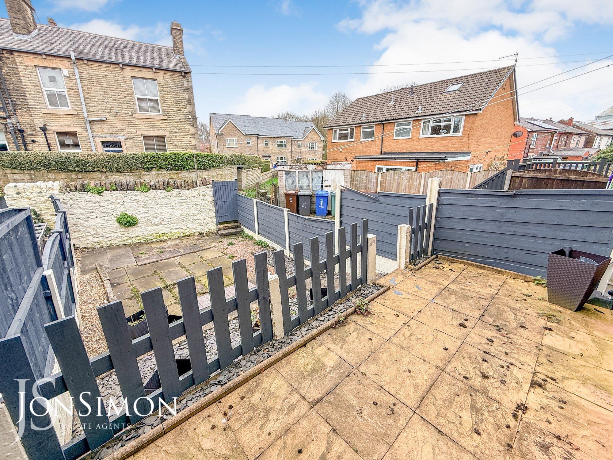 Rear: A paved patio area with steps leading down to additional paved area, outside water tap, shrubs and pebble borders. Gated access to the rear.