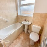 A three-piece white bathroom suite comprising of a panel bath with mixer taps, electric shower with glass shower screen, low level WC, wash hand basin, chrome towel radiator, storage cupboard, part tiled walls, ceiling point and UPVC double glazed front window.