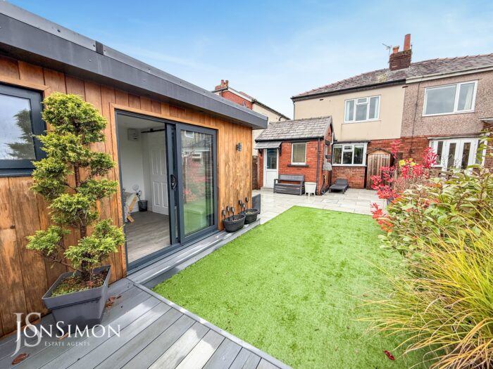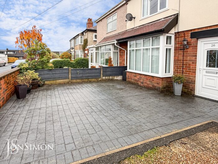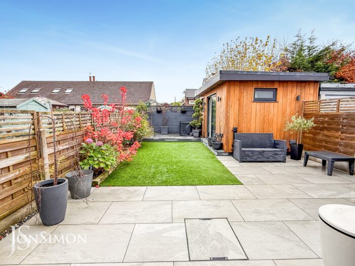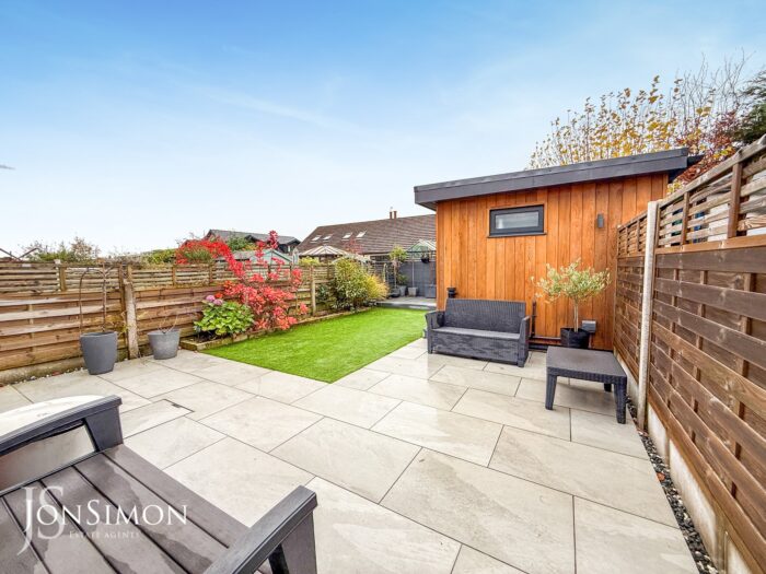 Externally there is a front garden with an in printed driveway providing off road parking and a shared driveway. A well-maintained rear garden with large paved patio area, outside water tap, Astroturf turf lawn, well maintained borders and shrubs, composite decking area, fence panel surround, external lighting, wooden shed and gated access to the side.