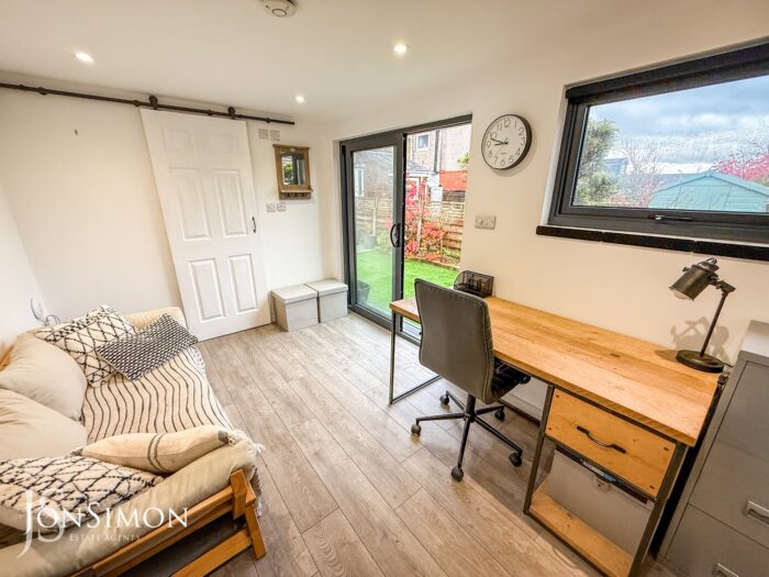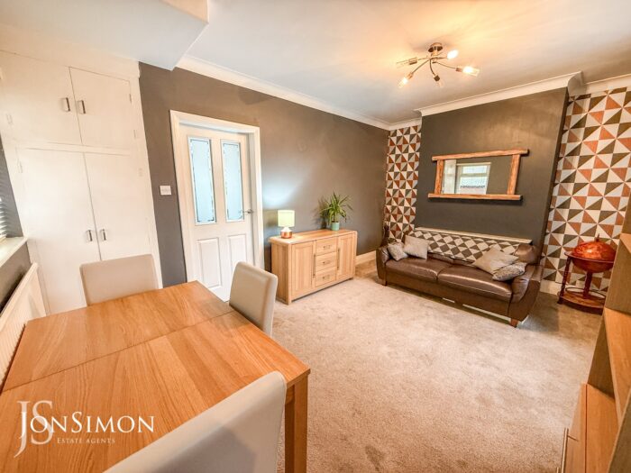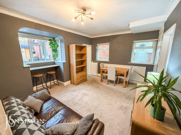 UPVC double glazed bay rear window, UPVC double glazed side windows, radiator, tiled fireplace, storage cupboards, meter cupboard, ceiling coving and ceiling point.