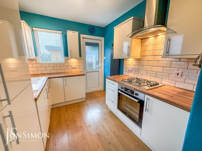 A modern fitted kitchen with a range of wall and base units with complementary worksurface, one and a half bowl sink unit with drainer, integrated fridge, freezer, washing machine, electric oven, four ring gas hob with extractor unit above, part tiled walls, radiator, ceiling point, UPVC double glazed rear and side windows, laminate flooring and UPVC double glazed back door.