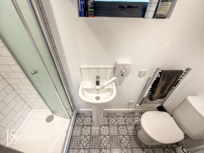 A modern three-piece white suite comprising of a walk-in shower unit with electric shower, low level WC, wash hand basin with electric hot water tap, chrome towel radiator, extractor unit, wall mounted storage cupboard, ceiling spotlights and aluminium double glazed side window.