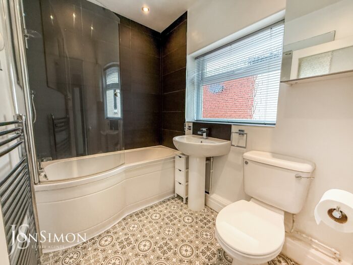 Modern three-piece white suite comprising of a panel bath with mixer tap, shower above, glass shower screen, low level WC, wash hand basin, chrome towel radiator, part tiled walls, extractor unit, ceiling spotlights and UPVC double glazed side window.
