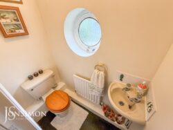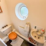 A two piece suite comprising of a low level WC, wash hand basin, radiator, part tiled walls, ceiling point and double glazed circular front window.