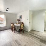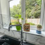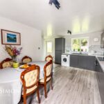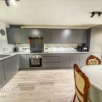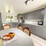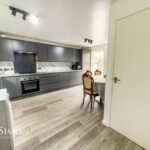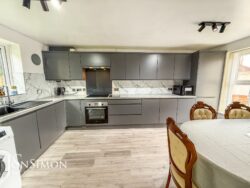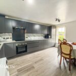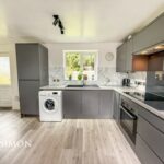 A modern fully fitted kitchen with a range of wall and base units, complementary work surfaces, four ring electric hob with extractor unit above, electric oven, plumbed for washing machine, Integrated fridge and freezer, radiators, wood effect flooring, ceiling point, storage cupboard and UPVC double glazed front and rear windows. UPVC double glazed back door.