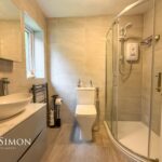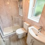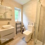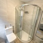 A modern three-piece suite comprising of a walk-in shower unit with electric shower, low level WC, wash hand basin with storage cupboard underneath, chrome towel radiator, wood effect flooring, ceiling point and UPVC double glazed side window.
