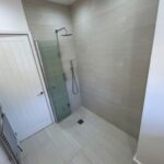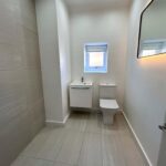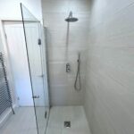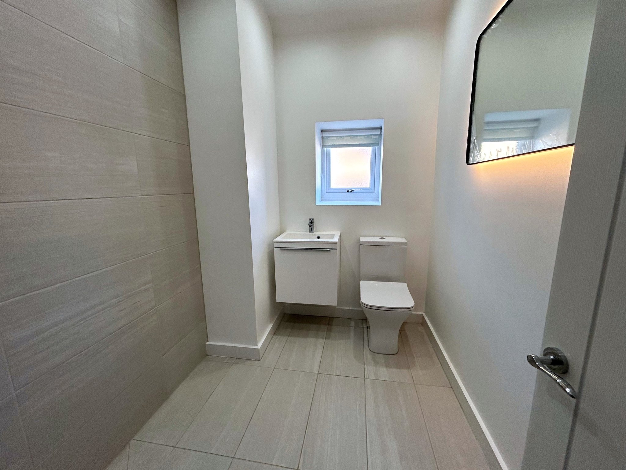 A modern three piece white suite comprising of a walk-in shower unit , low level WC, wash hand basin with storage cupboard underneath, chrome heated towel radiator, new wall mounted electric mirror, ceiling spotlights, part tiled walls and UPVC double glazed rear window.