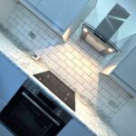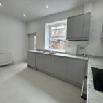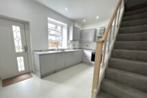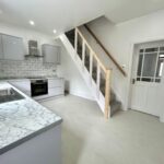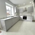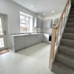 A modern brand new range of wall and base units with complementary worksurface, single sink unit with drainer, 'Bosch' four ring induction hob with extractor hood above, 'Bosch' electric oven, Integrated washing machine, tiled walls, Combi boiler, radiator, ceiling, spotlights, UPVC double glazed window, composite double glazed back door and stairs leading to the first floor landing.
