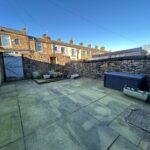 Enclosed flagged yard with gated access to the rear and stone wall surround.