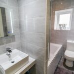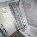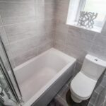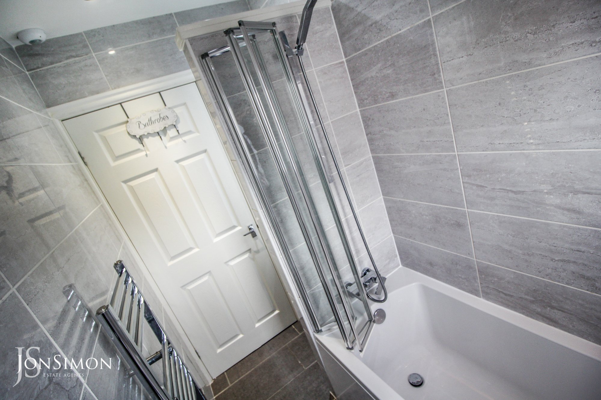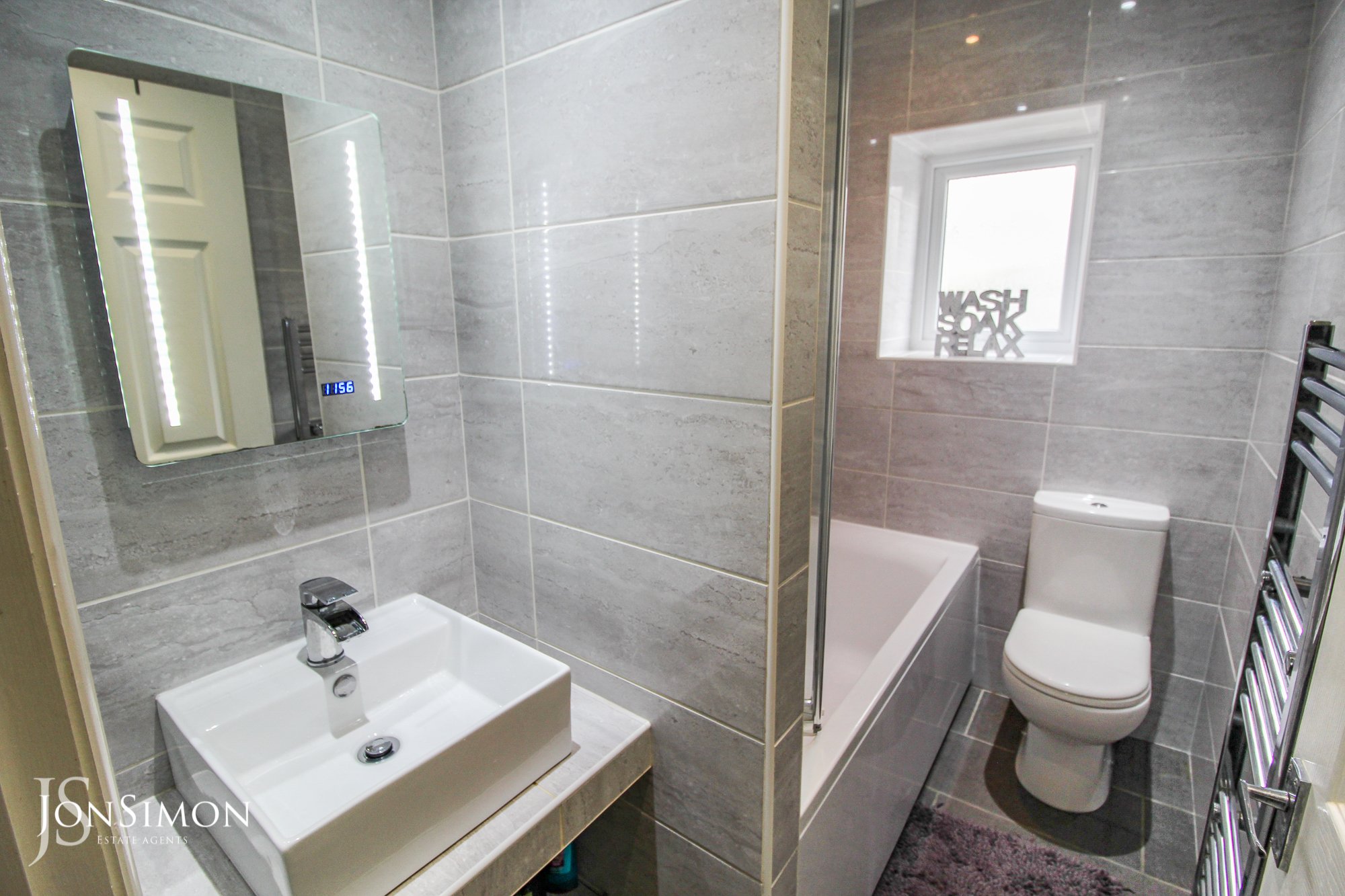 2.25m(7'5'') x 1.34m(4'5'') - A modern four piece white suite comprising panelled bath with shower and screen, hand wash basin, w.c., chrome towel radiator, fitted mirror, tiled walls and floor. UPVC double glazed rear window.